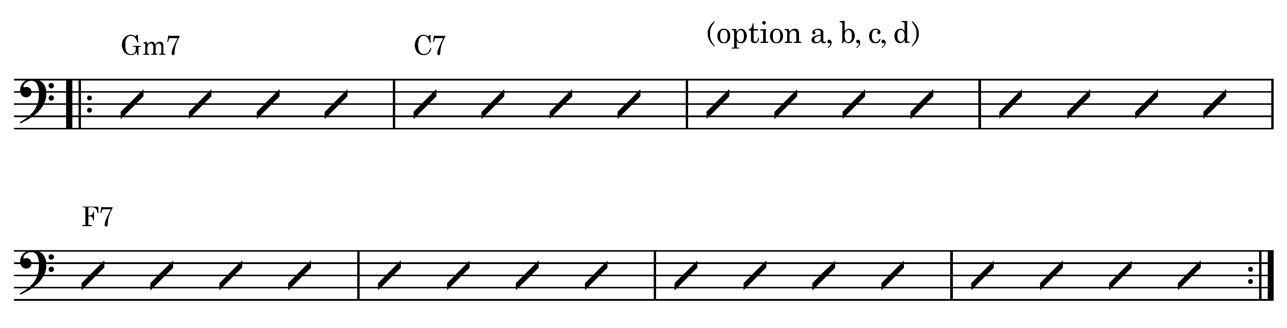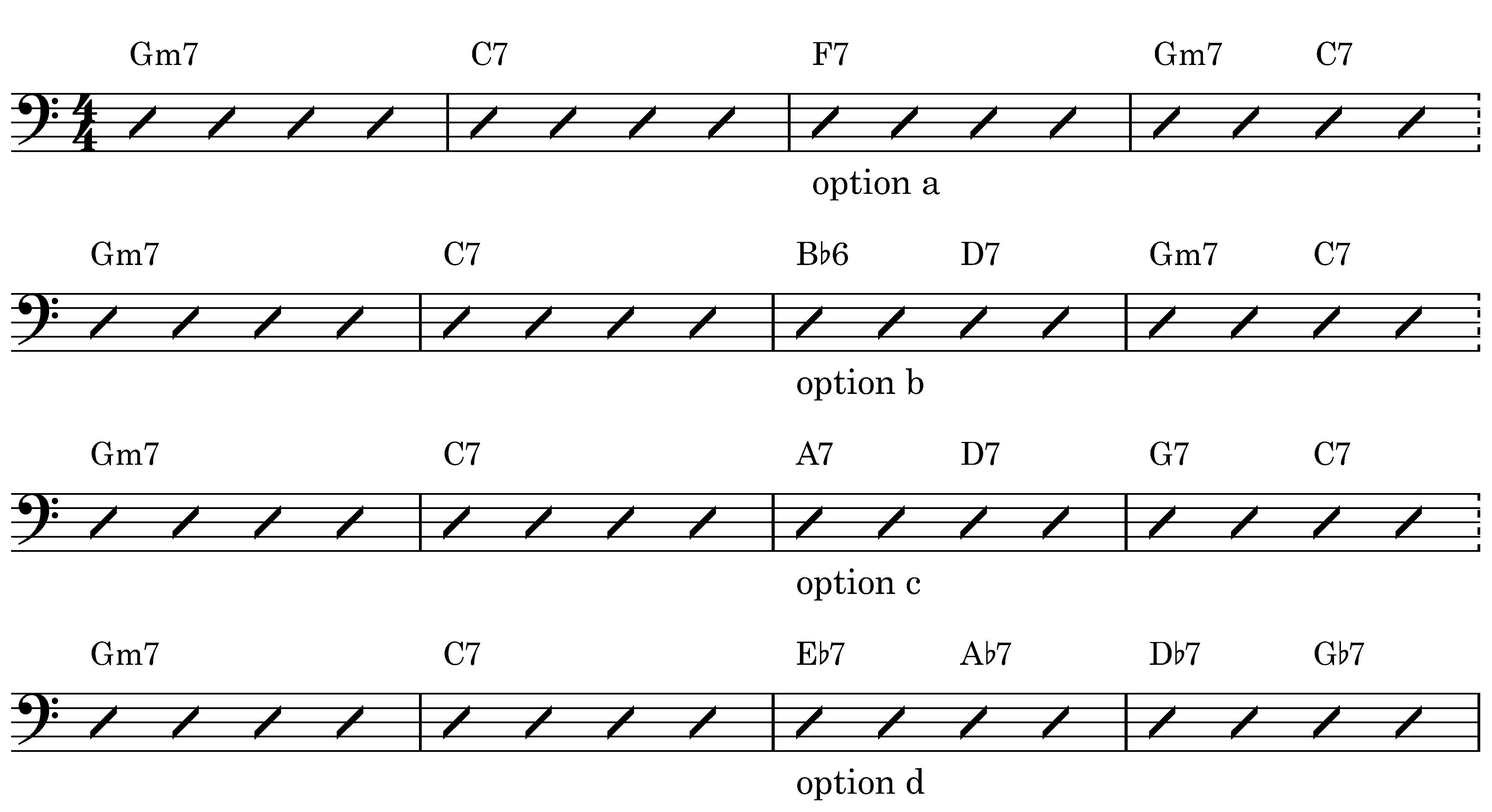 Four patterns (a, b, c, d) used on bar 9 to 12 of a typical F jazz blues.